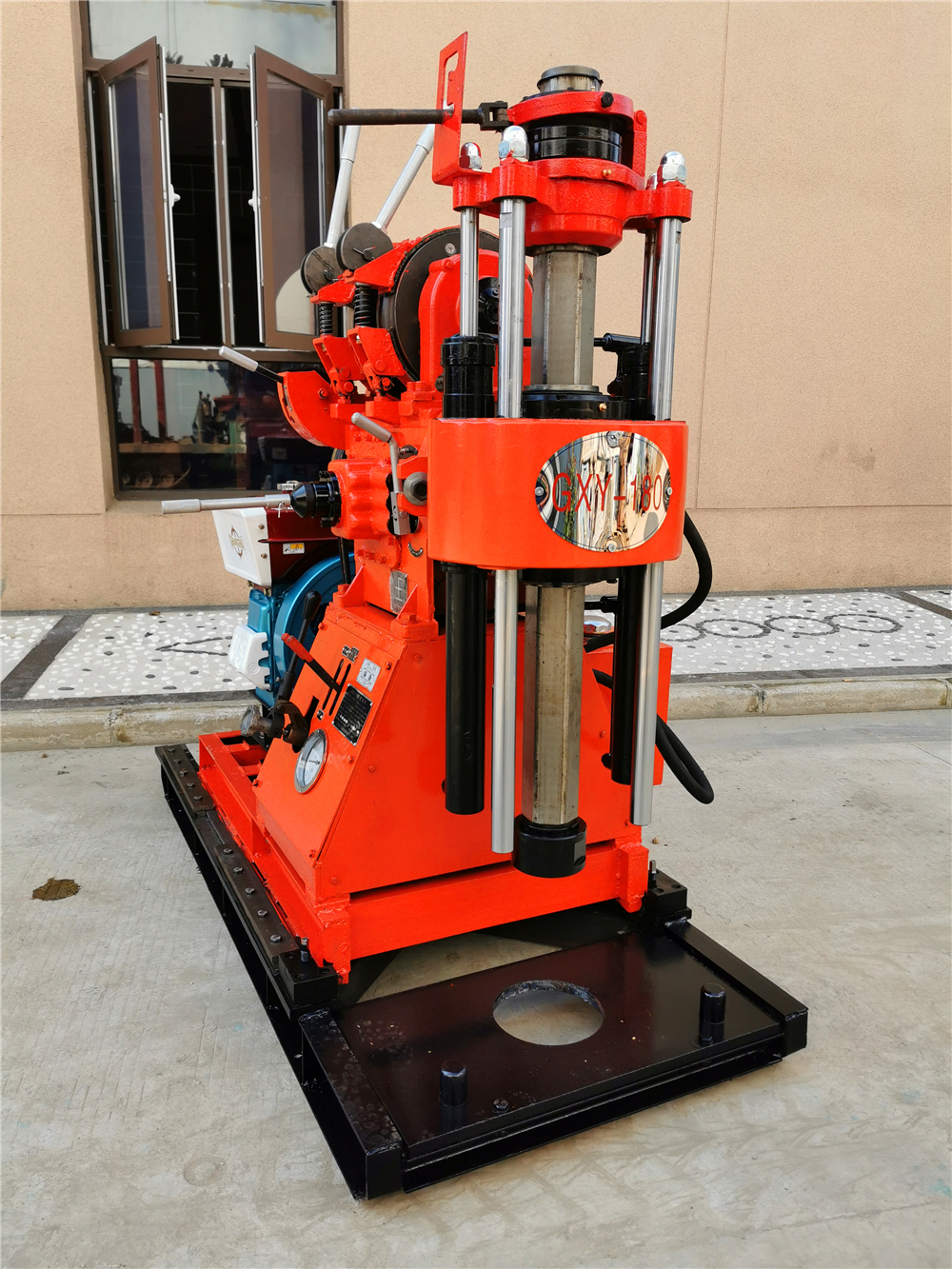主要特點:                                                1、鉆機輸入功率大,輸出扭矩大,鉆進能力強。                                                  2、鉆機輸出轉速范圍寬,既適用于工程地質勘察,又適用于金剛石巖芯鉆探。                                    3、鉆機配有高速功能,適合堅硬巖層的金剛石鉆進4、具有油壓給進機構,采用球卡式夾持機構,提高鉆進效率,減輕工人勞動強度。                                    5、采用了動力頭液控后移使機架讓開孔口,方便更換鉆桿、鉆具,以延長動力頭的壽命。                     6、鉆機配有加大主動鉆桿,可實現不停車倒桿,效率高,安全可靠。                                                  7、鉆機采用東風-12型手扶拖拉機的成熟結構,雙片常閉磨擦式離合器,開閉靈活,操作調整方便。 8、鉆機變速箱采用汽車變速箱式結構,單手把變速,并具有互鎖機構,操作方便。                                    9、鉆機結構緊湊,體積小,重量輕,最大部件在100kg以內,便于解體及搬運,適用于丘陵或山區工作。